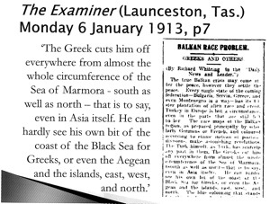 Για παράδειγμα, το Clarence and Richmond Examiner (από την επαρχιακή πόλη του Grafton στην βόρεια Nέα Νοτίου Ουαλία) Saturday 16 November 1912, ‘The most unsettling news which has so far been received is that the Turks have proclaimed a Holy War throughout Turkey. … It means in effect, that an edict has been issued, the substance of which is “slaughter till slaughtered”. … the effect of it is to kindle a dauntless courage and unconcern for consequences, and a ferocity towards all the Christians, which will result in wholesale carnage.’ Δηλαδή πρόεβλεψαν την Γενοκτονία των Ελλήνων, των Αρμενίων και των Ασσυρίων.