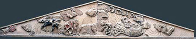 Πώρινη εναέτια σύνθεση που κοσμούσε κάποιο μικρό αρχαϊκό κτίριο ή, σύμφωνα με άλλη ερμηνεία συμπλήρωνε, το ένα από τα αετώματα του παλαιού Παρθενώνα, (του λεγόμενου «Εκατομπέδου»). Είναι έργο αττικού εργαστηρίου και έχει ως θέμα την «Αποθέωση του Ηρακλή», δηλαδή την υποδοχή του στον Όλυμπο μετά τον θάνατό του. Αριστερά εικονίζεται το ζεύγος των θεών, ο Δίας, που υποδέχεται τον ήρωα καθισμένος σε θρόνο και η Ήρα, η οποία αποδίδεται καθισμένη κατά μέτωπο, με τρόπο, δηλαδή, τολμηρό για την εποχή. Προς το μέρος τους βαδίζει γοργά ο Ηρακλής, που φοράει κοντό χιτώνα και τη χαρακτηριστική λεοντή και τον ακολουθάει η Ίριδα, (ή ο Ερμής) αγγελιοφόρος των θεών. Ανάμεσά τους υπήρχε κι άλλη μια θεϊκή μορφή, πιθανόν η Αθηνά, προστάτιδα του ήρωα, που τον οδηγούσε στον πατέρα της. Η σύνθεση επιστέφεται από ανάγλυφο και γραπτό κυμάτιο και τονίζεται με πλούσια χρώματα, ίχνη των οποίων σώζονται μέχρι και σήμερα. Αξιοσημείωτη είναι η έμφαση του καλλιτέχνη σε διακοσμητικές λεπτομέρειες, που αποδίδονται με ανάγλυφο ή εγχάραξη (570 π.Χ.).