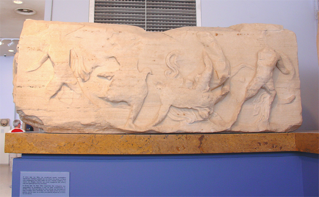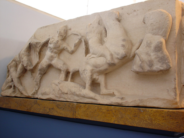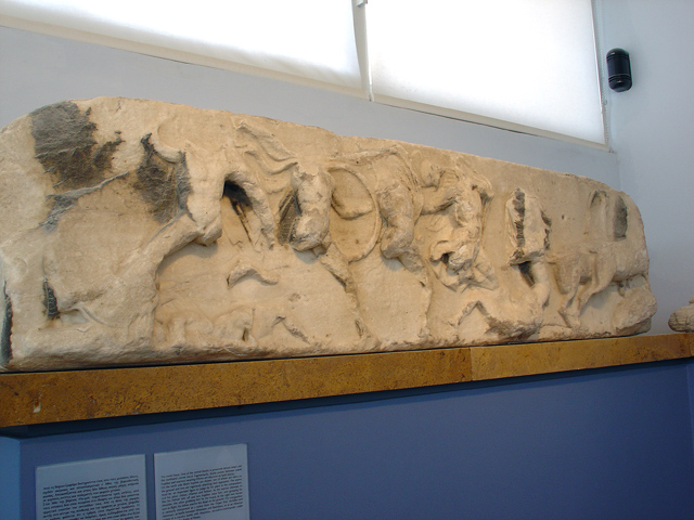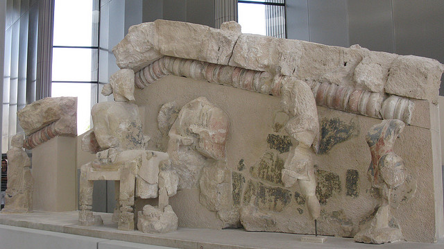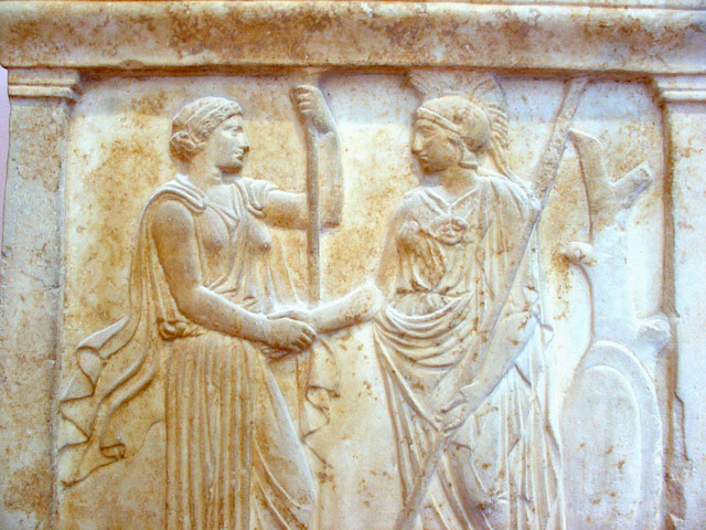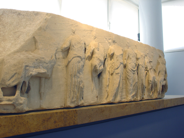 Επιτύμβια τράπεζα θυσιών (mensa), 350-325 π.Χ. Ανάγλυφες παραστάσεις θρήνου, αποχαιρετισμού και μεταθανάτιας συνάντησης του νεκρού με φιλοσόφους.