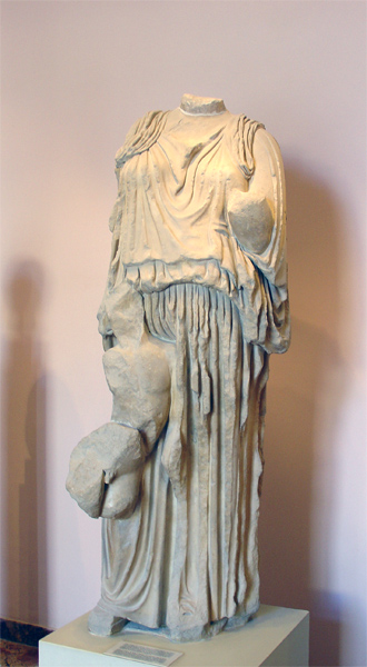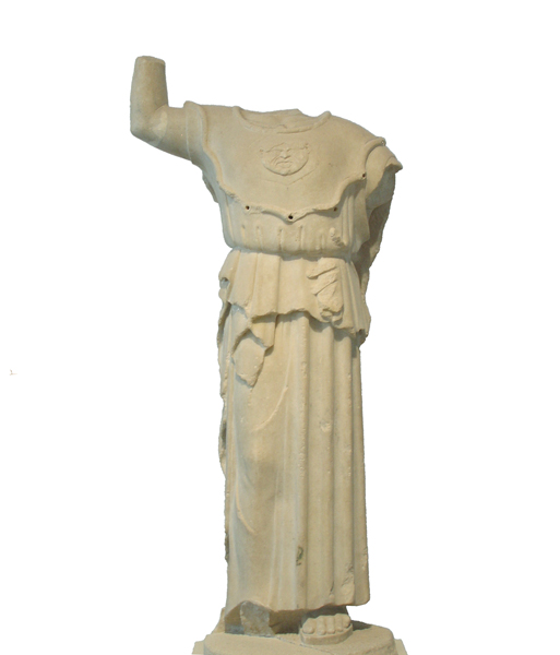 ΔΥΟ ΑΓΑΛΜΑΤΑ ΠΗΛΙΝΩΝ ΝΙΚΩΝΔύο πανομοιότυπα αγάλματα Νικών, από τα οποία λείπουν οι βραχίονες και τα φτερά. Τα τεντωμένα και ενωμένα πόδια τους δείχνουν ότι οι Νίκες πετούν. Πιθανόν να αποτελούσαν ακρωτήρια κάποιου κτιρίου. Αν και το σοβαρό τους πρόσωπο θυμίζει κλασική τέχνη, η επιπόλαιη εργασία στις πτυχές των ρούχων τους και στη χάραξη των μαλλιών δείχνουν ότι πρόκειται για ρωμαϊκά έργα.