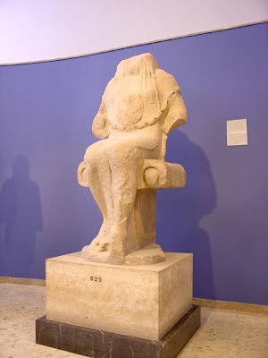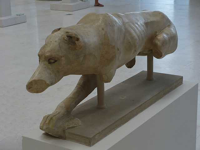 Ένα από τα δύο σκυλιά (το άλλο σώζεται αποσπασματικά) που εικάζεται ότι φύλαγαν την είσοδο του ιερού της Αρτέμιδος Βραυρωνίας στη νοτιοδυτική πλευρά της Ακρόπολης. Από τις πιο εντυπωσιακές παραστάσεις ζώων, λιπόσαρκο, με λυγισμένα τα σκέλη και τεντωμένο το κεφάλι, φαίνεται έτοιμο να ορμήσει μπροστά. Πιθανότατα ήταν στημένος μαζί με ένα όμοιό του που σώζεται αποσπασματικά, στην είσοδο του ιερού της Βραυρωνίας Αρτέμιδος στη νοτιοδυτική πλευρά της Ακρόπολης. Αξιοπρόσεκτη είναι η απόδοση της ανατομίας του ζώου και η εξαιρετική λείανση της επιφάνειας (Γύρω στο 520 π.Χ.).