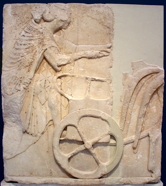 Η μορφή εικονίζεται τη στιγμή που ανεβαίνει στο άρμα με το ένα πόδι στον δίφρο, κρατώντας τα χαλινάρια των αλόγων. Φορά χιτώνα και ιμάτιο ριγμένο στους ώμους και έχει τα μαλλιά δεμένα σε κρωβύλο. Δεν είναι βέβαιο αν αποδίδει άνδρα ή γυναίκα, γι’ αυτό έχει ερμηνευτεί ως Άρτεμις ή Απόλλωνας. Η πλάκα συνδέεται με εκείνη του Ερμή, με την οποία ίσως αποτελούσε συνεχή ζωφόρο. Τα γλυπτά αυτά, μαζί με άλλα θραύσματα, έχουν αποδοθεί στον διάκοσμο του Αρχαίου Ναού της Αθηνάς. Τελευταίο τέταρτο του 6ου αιώνα π.Χ.
