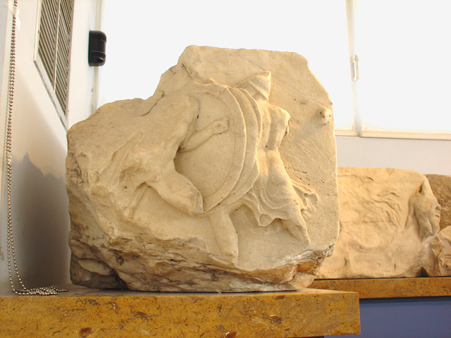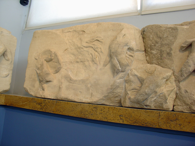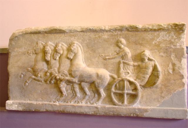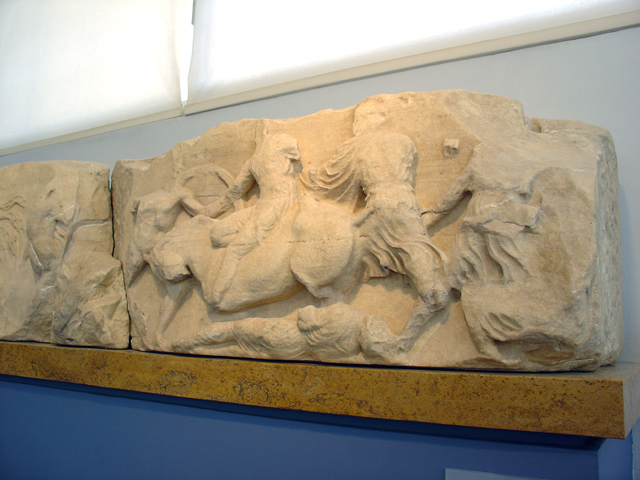 Τμήμα από τη μαρμάρινη βάση αναθήματος με ανάγλυφη παράσταση ενός τεθρίππου και αποβάτη. Η παράσταση θυμίζει το λίθο XVII ( αρ. 859) της βόρειας πλευράς της ζωφόρου του Παρθενώνα. Κατά την αποβασία, που αποτελούσε μέρος του αθλήματος της αρματοδρομίας, ο οπλίτης κατεβαίνει και ανεβαίνει στο εν κινήσει άρμα του κατά τα τελευταία μέτρα του δρόμου. Η βάση χρονολογείται γύρω στα 400 π.Χ.