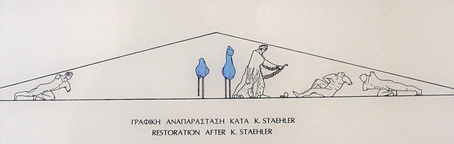 Το δυτικό αέτωμα κοσμούσε σύνθεση λεόντων που κατασπαράζουν ταύρο, αποσπασματικά διατηρημένη. Δύο ημίτομα άλογα προέρχονται από μετωπική παράσταση τεθρίππου, ίσως του Δία, που σύμφωνα με παλαιότερη άποψη, θα ήταν στο κέντρο του αετώματος της Γιγαντομαχίας, ενώ σύμφωνα με νεότερη, θα καταλάμβανε το κέντρο του δυτικού αετώματος. Οι μορφές εντυπωσιάζουν με τη δυναμική πλαστική τους και τις έντονες κινήσεις τους, καθώς και με τη δήλωση των λεπτομερειών που τονίζονταν άλλοτε με χρώματα, όπως η αιγίδα της Αθηνάς. Είναι έργα μεγάλου καλλιτέχνη που παραμένει άγνωστος. Από τους μελετητές έχουν προταθεί σημαντικοί γλύπτες της αρχαϊκής εποχής, από τους οποίους επικρατέστεροι είναι ο Αντήνωρ και ο Ένδοιος.