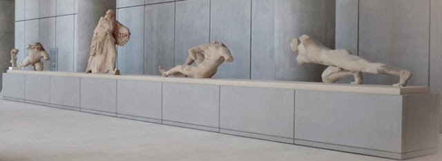 Η μαρμάρινη σύνθεση με θέμα τη Γιγαντομαχία (δηλαδή τη μάχη των θεών του Ολύμπου εναντίον των Γιγάντων) κοσμούσε το ανατολικό αέτωμα του αρχαϊκού ναού της Αθηνάς Πολιάδος, τα θεμέλια του οποίου βρίσκονται στα νότια του Ερεχθείου. Ο ναός ήταν αφιερωμένος στην Αθηνά Πολιάδα και στέγαζε το λατρευτικό της ξόανο. Καταστράφηκε από τους Πέρσες στα 480 π.Χ. Τα γλυπτά είναι από παριανό μάρμαρο, λαξευμένα περίοπτα, καινοτομία στην οποία έφτασε η αρχιτεκτονική γλυπτική στα ύστερα αρχαϊκά χρόνια.