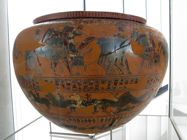 Η σκηνή ερμηνεύεται ως ο φόνος του Τρωίλου, γιού του Πριάμου, από τον Αχιλλέα ή ως τελετουργική πομπή στο ιερό της θεάς Αθηνάς (560-550 π.Χ., πωρόλιθος).