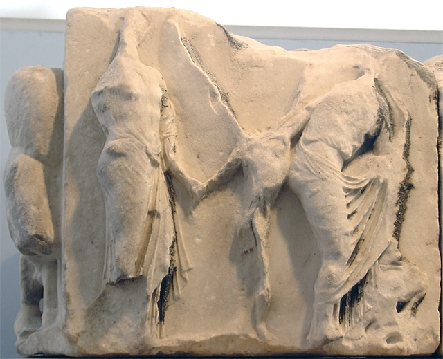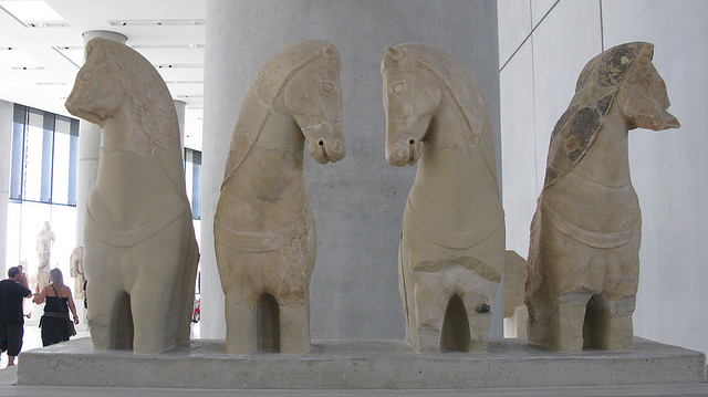 Τέσσερα ημίτομα αλόγων τεθρίππου (άρμα συρόμενο από τέσσερα άλογα) από μάρμαρο Υμηττού, τα οποία προέρχονται από ένα αναθηματικό ή αρχιτεκτονικό ανάγλυφο. Ο ηνίοχος και ο δίφρος του άρματος αρχικά θα παριστάνονταν μετωπικά, ανάγλυφα ή ζωγραφιστά, στο φόντο που έχει χαθεί. (Στον ηνίοχο έχει αποδοθεί το τμήμα κεφαλής αρ. 637). Τα άλογα, με τις χαίτες τους διακοσμημένες με πράσινο χρώμα, σχηματίζουν συμμετρική σύνθεση: τα μεσαία είναι αντικριστά ενώ τα ακραία κλίνουν τα κεφάλια προς τα έξω. Γύρω στα 570 π.Χ.
