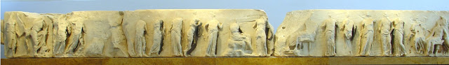 Η ανατολική πλευρά της ζωφόρου αποτελείται από τέσσαρες λίθους, από τους οποίους σώζονται τρεις, ο λίθος της ΝΑ γωνίας και δύο μεσαίοι λίθοι. Το δεξιό άκρο του τρίτου και ο λίθος της ΒΑ γωνίας έχουν χαθεί. Η παράσταση εικονίζει συνάθροιση θεών και περιλαμβάνει 24 μορφές (αρχικά θα ήταν 27 ή 28) σε σύνθεση που εκτυλίσσεται συμμετρικά με άξονα την κεντρική μορφή της Αθηνάς.