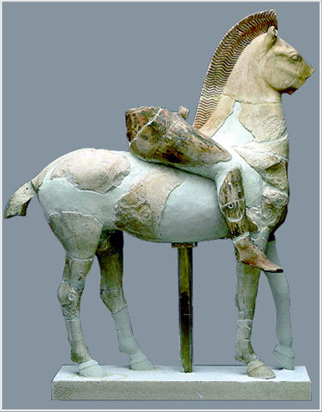 Ο λεγόμενος «Πέρσης› ή «Σκύθης› ιππέας είναι από τα σημαντικότερα αγάλματα ιππέων που είχαν προσφερθεί στο ιερό της Αθηνάς κατά την αρχαϊκή εποχή. Την ονομασία του οφείλει στο ανατολικής προέλευσης ένδυμα που φορεί, κοντό χιτώνα ως την αρχή των μηρών, που είναι διακοσμημένος με χρωματιστά ανθέμια και περισκελίδες με διακόσμηση ρόμβων. Το άγαλμα ήταν κατασκευασμένο από ένα ενιαίο κομμάτι λίθου στο οποίο έχει προστεθεί το φτιαχτό σκέλος του ιππέα. Δεν σώζεται ολόκληρο, αλλά έχει συγκολληθεί από πολλά θραύσματα και έχει συμπληρωθεί με γύψο. Στη σημερινή, πιο ολοκληρωμένη, μορφή του αποκαταστάθηκε μόλις στα τέλη της δεκαετίας του 1990. Από τον ιππέα διατηρούνται το κάτω μέρος του σώματος και τα πόδια με τα κλειστά υποδήματα. Είναι καθισμένος πολύ μπροστά, σχεδόν στο λαιμό του ζώου. Είναι έργο άγνωστου γλύπτη, αλλά σίγουρα αττικού εργαστηρίου, όπως και όλοι σχεδόν οι αρχαϊκοί ιππείς της Ακρόπολης.