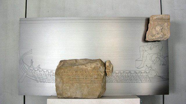 Θραύσμα ανάγλυφου με τμήμα αθηναϊκής πολεμικής τριήρους με εννέα κωπηλάτες. Σ’ αυτό ανήκουν επίσης δύο θραύσματα στην αποθήκη και το Εθνικό Μουσείο. Σε τρεις επάλληλες σειρές γυμνοί κωπηλάτες σκυφτοί κωπηλατούν. Στο κατάστρωμα του πλοίου βρίσκεται ο κυβερνήτης. Σύμφωνα με την αποκατάσταση του L. Beschi, η αρχική σύνθεση απεικόνιζε μια μεγάλη τριήρη με 25 κωπηλάτες, τον πρωραία και τον κυβερνήτη. Ο έφηβος, στο άνω δεξιό μέρος, παριστάνει πιθανώς τον ήρωα Πάραλο, εφευρέτη της ναυσιπλοΐας (410-400 π.Χ.).