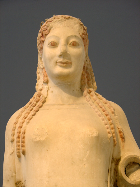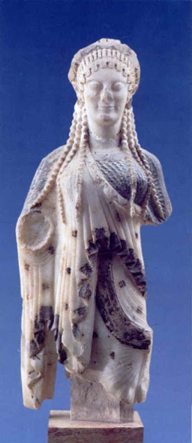 Μικρή κόρη με ιωνικό χιτώνα, που ανασηκώνει χαριτωμένα με το αριστερό της χέρι, και κοντό λοξό ιμάτιο, στερεωμένο στον δεξιό ώμο. Αξιοπρόσεκτες είναι οι λεπτομέρειες και η πολύχρωμη διακόσμηση των ενδυμάτων. Τα χαρακτηριστικά του προσώπου αποδίδονται με τρυφερότητα. Η κόμμωση είναι περίτεχνη και στολίζεται με «στεφάνη» (χαμηλό διάδημα) με ένθετα μεταλλικά κοσμήματα. Η κόρη αντανακλά τη χάρη και τη ζωντάνια της ιωνικής τέχνης. Παλαιότερα είχε συσχετισθεί με βάση που έφερε υπογραφή καλλιτέχνη από τη Χίο, γι’ αυτό ονομάσθηκε «Χιώτισσα» (510 π.Χ.).