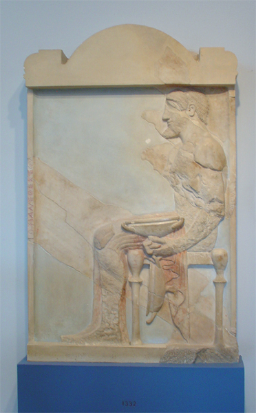 Αναθηματικό ανάγλυφο. 400 π.Χ. Ο Ασκληπιός κάθεται σε ομφαλό ανάμεσα στη σύζυγό του Ηπιόνη και έναν ιματιοφόρο άνδρα.