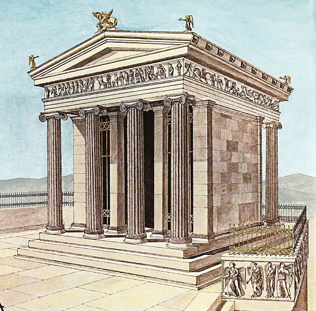 Ο ναός της Αθηνάς Νίκης είναι ιωνικού ρυθμού, τετρακίονος, αμφιπρόστυλος, και οικοδομήθηκε μεταξύ των ετών 427 και 424 π.Χ. με βάση τα σχέδια του αρχιτέκτονα Καλλικράτη. Η ανάγλυφη ζωφόρος που κοσμούσε τις 4 πλευρές του θριγκού υπολογίζεται ότι είχε συνολικό μήκος 25,94 μ. Αποτελείται από 14 λίθους ύψους 0,45 και πάχους 0,40 μ., από τους οποίους σώθηκαν και τοποθετήθηκαν οι 7, στη δεύτερη αναστήλωση του μνημείου. 4 λίθοι, που ήταν εντοιχισμένοι στον τουρκικό προμαχώνα, αφαιρέθηκαν από τον Έλγιν, μετατράπηκαν σε πλάκες πάχους 0,12 μ. και πωλήθηκαν στο Βρετανικό Μουσείο, ενώ στο μνημείο αντικαταστάθηκαν με τσιμεντένια αντίγραφα. Η ακριβής διάταξη των λίθων και η αποκατάσταση της σύνθεσης των ανάγλυφων παραστάσεων της ζωφόρου δεν είναι απόλυτα σίγουρη. Αμφισβητείται η θέση των λίθων της δυτικής, βόρειας και νότιας πλευράς, καθώς και η ερμηνεία των παραστάσεων στο σύνολό τους.
