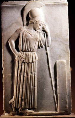 Το ανάγλυφο της σκεπτόμενης Αθηνάς ή Αθηνά προ στήλης (προγενέστερος τίτλος) είναι αρχαίο αττικό ανάγλυφο, και ένα από τα πιο γνωστά έργα, που είχαν ανατεθεί στην Ακρόπολη. Το ανάγλυφο βρέθηκε το 1888 στον αρχαιολογικό χώρο της Ακρόπολης νότια του Παρθενώνα, μεταξύ του κρηπιδώματος του ναού και του νοτίου τείχους της Ακρόπολης. Το σημείο αυτό ήταν ίσως το εργαστήριο κατασκευής γλυπτών κατά την επί Περικλέους οικοδόμηση του Παρθενώνα. Η λίθινη στήλη ήταν καλυμμένη με γαλάζιο χρώμα, επάνω στο οποίο προβαλλόταν η μορφή της θεάς. Χαμηλά προεξέχει μια λεπτή ταινία που παριστάνει το έδαφος, στο οποίο επάνω στέκει η θεά Αθηνά. Το έδαφος του ανάγλυφου ήταν χρωματισμένο με γαλάζια μπογιά όπως διαπιστώθηκε από την έρευνα. Το ίδιο χρώμα έφερε και η τετραγωνική επιμήκης στήλη που στέκει όρθια στο δεξί μέρος του ανάγλυφου. Η στήλη ήταν διακοσμημένη με μια ταινία εν είδη επικράνου. Η Αθηνά παριστάνεται όρθια, με αττικό πέπλο χωρίς μανίκια, με ζωσμένο απόπτυγμα, και ανασηκωμένο κορινθιακό κράνος, χωρίς σανδάλια, με το δεξί πόδι σταθερό και το αριστερό χαλαρό, προς τα πίσω. Στέκει μπροστά στην στήλη, Στρέφεται προς τα δεξιά, ελαφρά κλίνοντας μπροστά, έχοντας το δεξί χέρι στην μέση, ενώ με το αριστερό χέρι στηρίζει το δόρυ. Με το κεφάλι, ελαφρά γερμένο προς τα κάτω, ατενίζει συλλογισμένη μια ορθογώνια στήλη που βρίσκεται μπροστά της, το ορόσημο του ναού της ή μια επιτύμβια στήλη ή ένα κατάλογο λογαριασμών του ιερού της, σύμφωνα με τις υποθέσεις που έχουν διατυπωθεί. Η έκφραση της Αθηνάς εμπνέει μελαγχολία ή λύπη. Πιθανόν επειδή η στήλη να δηλώνει επιτύμβιο μνημείο των πεσόντων στρατιωτών των μηδικών πολέμων προς υπεράσπιση της πατρίδας. Η στάση της θεάς και η απόδοση του ενδύματός της είναι τυπικά γνωρίσματα του αυστηρού ρυθμού. Χαρακτηριστικά της εποχής είναι ακόμη, η έντονη εσωτερικότητα της μορφής, και η προσπάθεια του καλλιτέχνη να αποδώσει τα συναισθήματα. Η διάσταση της Αθηνάς, το περίγραμμα των μορφών, και η διάπλαση των μελών του σώματος είναι κάλλιστα γνωρίσματα της τελειοποιημένης τέχνης. Οι πτυχές του χιτώνα δείχνουν ότι ο καλλιτέχνης δεν είναι απαλλαγμένος από την επίδραση της αρχαϊκής τέχνης. Το ανάγλυφο έχει ύψος 54 εκ., πλάτος 32-31,5 εκ, πάχος 0,5 εκ. και θεωρείται έργο αττικού εργαστηρίου των πρώιμων κλασικών χρόνων. Το ανάγλυφο κατατάσσεται στου τελευταίους χρόνους του πρώτου ήμισυ του 5ου π.Χ. αιώνα.Η «ΚΟΡΗ ΤΗΣ ΛΥΩΝ»