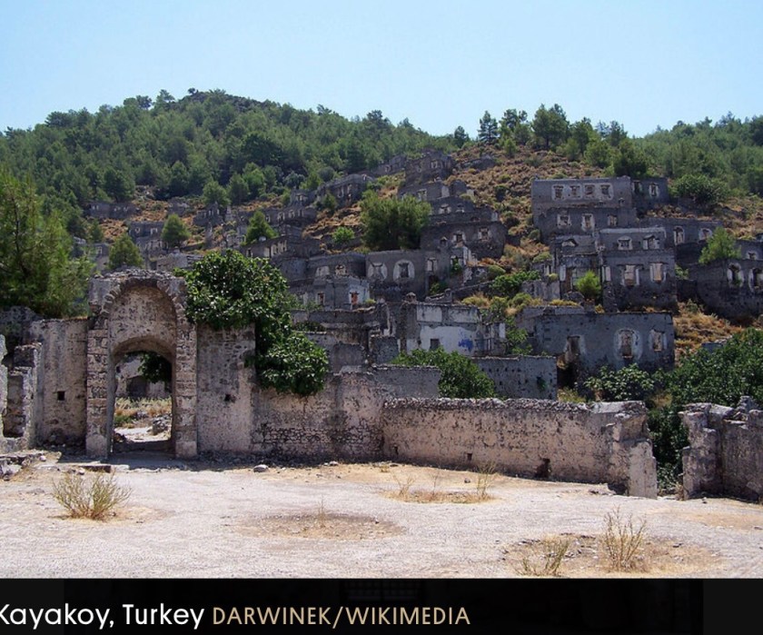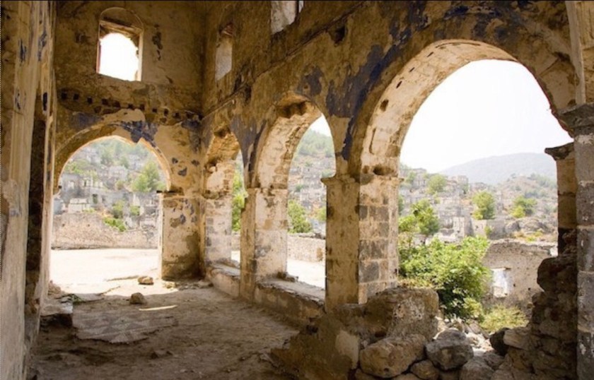 In Kayakoy, approximately 350 homes now sit empty and mostly roofless, along with two Greek Orthodox churches and the fountains and cisterns that watered the city. Harsh winters and strong winds have stripped the buildings down to ruins, making the town look ancient. A private museum tells the story of the town.