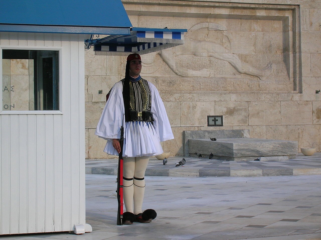 Today, it refers to the members of the Presidential Guard (Greek: Προεδρική Φρουρά; Proedrikí Frourá), an elite ceremonial unit that guards the Greek Tomb of the Unknown Soldier (Greek: Μνημείο του Άγνωστου Στρατιώτη; Mnimeío tou Άgnostou Stratiόti), the Presidential Mansion and the gate of Evzones camp in Athens. An Evzone (Greek: Εύζωνας) is also known, colloquially, as a Tsoliás (Greek: Τσολιάς, Τσολιάδες; pl. Tsoliádes).