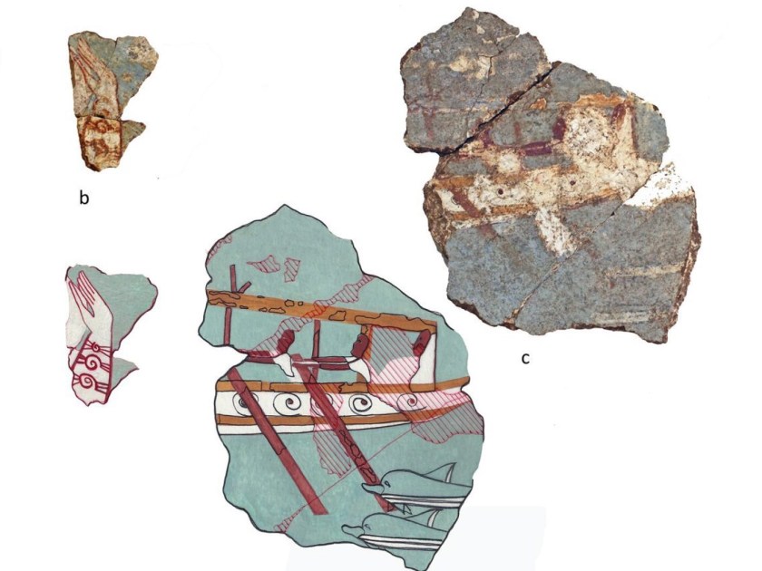 Fragment (right) of an ancient Greek wall painting at a site in Iklaina: The earliest naval representation from the Greek Mainland. Michael Cosmopolous.