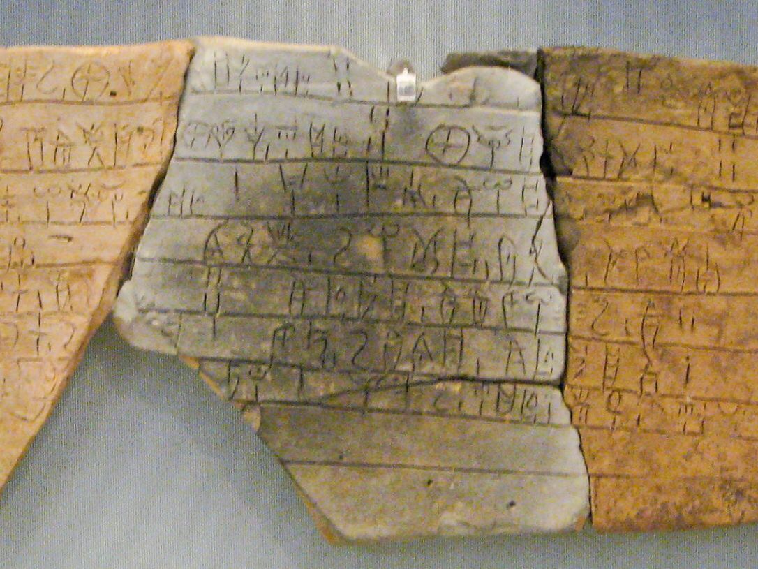 Clay tablet inscribed with Linear B, from the Palace of Nestor in Pylos. It contains information on the distribution of bovine, pig and deer hides to shoe and saddle-makers. Sharon Mollerus, Wikimedia Commons.