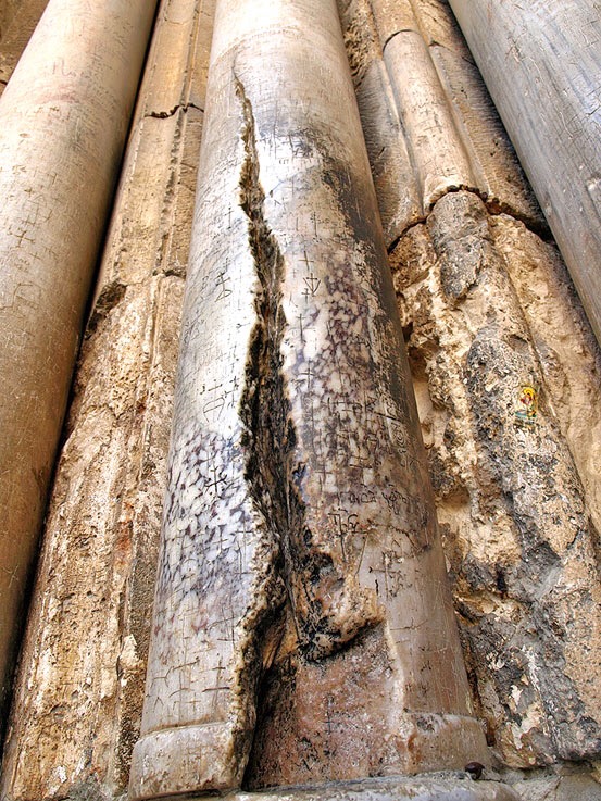 «Έξω δε της Αγίας Πόρτας, πλησίον εις το δυτικόν μέρος, είναι γ΄ κολόναις μαρμαρέναις, και από την μεσινήν κολόναν, λέγουν, ότι ευγήκεν το Άγιον Φως τον παλαιόν καιρόν. Και είναι σχισμένη καμπόσον και φαίνεται έως την σήμερον. Και αυτό το θαύμα το έδειξεν ο θεός τοιουτοτρόπως, επειδή λέγουν, ότι εις τον καιρόν εκείνον δεν άφησαν, εκείνοι οπού όριζαν τον πατριάρχην, να σέβουν [εισέλθουν] μέσα να κάμουν την εορτήν της Λαμπράς, κατά την συνήθειαν.