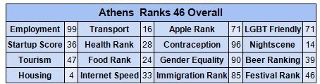 Out of 100, Athens scored 99 for employment, 16 for transport, 71 for LGBT friendliness, 36 for startups, 28 for health, 96 for contraception, 14 for its night scene, 47 for tourism, 14 for food, 24 for gender equality, four for housing, 33 for Internet speed and 85 for immigration.