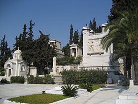 Foreground: Tomb of the Pesmazoglou family (right) and Melina Mercouri (middle). Background: Tomb of Heinrich Schliemann (left on the high pedestal).