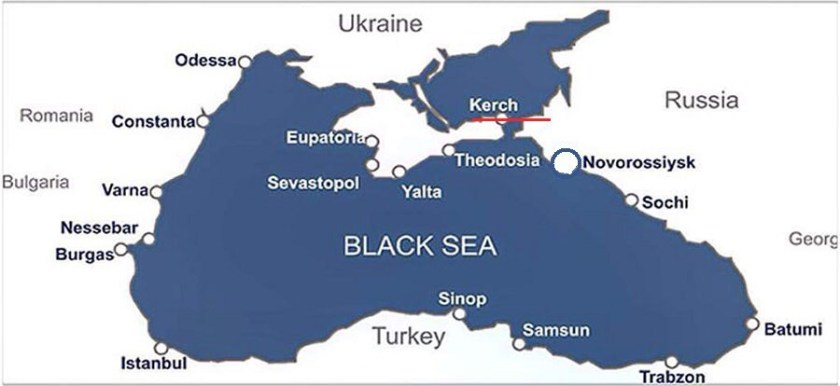In Kerch Bay, in the strait that occupies the east coast of the Crimean peninsula, where the Black Sea meets the Sea of Azov, a group of Russian builders are working on a bridge that will eventually join the two coasts.