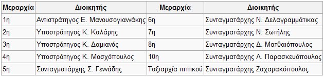 Κατά το Β’ Βαλκανικό πόλεμο ο ελληνικός στρατός είχε αυξηθεί κατά πολύ με εκγυμνάσεις και νεότερων κλάσεων και της παρένταξης αυτών σε παλαιότερες μονάδες. Επίσης το Γενικό Επιτελείο είχε οργανώσει ακόμη μια μεραρχία τη 10η, από 8 αρχικά σε 9 περί το τέλος του πολέμου. Έτσι ο ελληνικός στρατός που είχε ταχθεί υπό την αρχιστρατηγία του Βασιλέως Κωνσταντίνου του Α’ με επιτελάρχη τον συνταγματάρχη Β. Δούσμανη, συγκροτούνταν από τις εξής μεραρχίες: